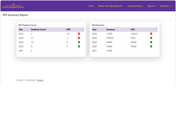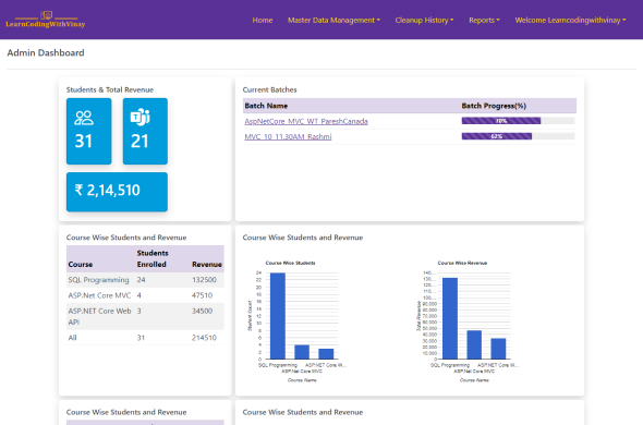 - Informative Dashboard: Developed a comprehensive dashboard featuring a summary of student enrollments, an annual earnings overview, and visual graphs for performance tracking and actionable business insights.